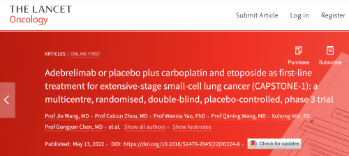 北京时间2022年5月14日,九游会医药自主研发的PD-L1抑制剂阿得贝利单抗治疗广泛期小细胞肺癌的III期临床研究(CAPSTONE-1研究)成果正式全文在线发表于国际权威学术期刊《柳叶刀·肿瘤学》(《THE LANCET Oncology》,影响因子41.316)。CAPSTONE-1研究结果显示,阿得贝利单抗联合化疗一线治疗广泛期小细胞肺癌相较于安慰剂联合化疗可以显著延长患者总生存期至15.3个月[1],刷新现有免疫药物一线治疗广泛期小细胞肺癌的总生存纪录[2]